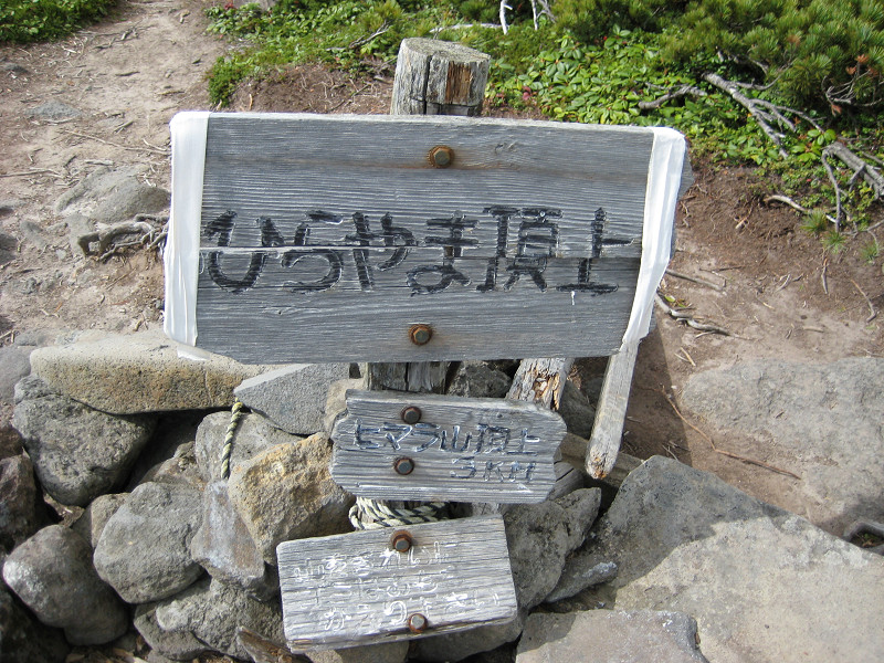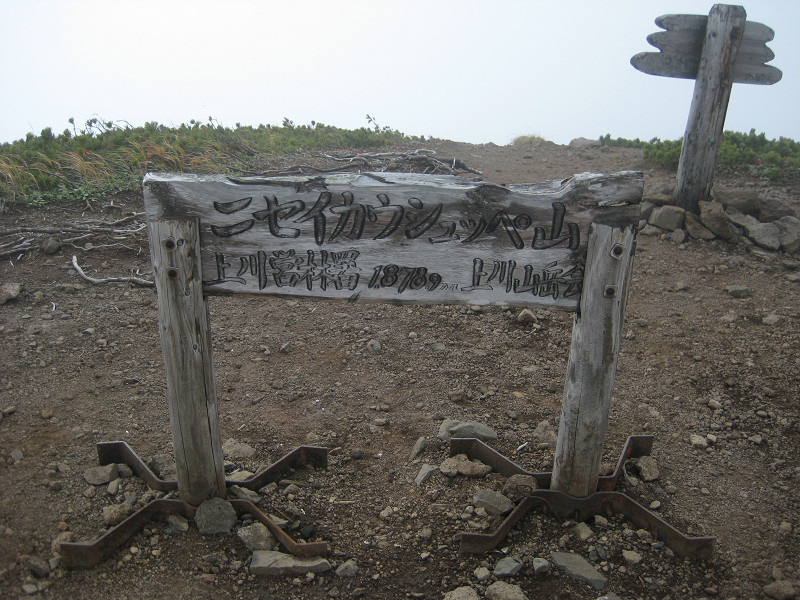 ニセイカウシュッペ山へ行ってきました。林道ゲートの鍵を開けようとすると、最初から鍵はかかっていませんでした。しかし、鍵の番号が知人に聞いていた「1372」ではなく「1732」だったので、とりあえず開いてて良かったといった感じ。この山は標高1150mぐらいまで車で行けるようになり、景色も良いため、最近は人気の山らしく、早めに行ったのですが、登山口の駐車場に着くと既に5台程車が駐車していました。ところが、入山記録を見ると昨日の夕方4:30に入山した人が下山していないぐらいで、私が本日一人目の入山者だったのです。ということは、ここにある車の人達はどこへ行ったのでしょう?途中、道はどろどろで歩きにくいし、笹やはい松の露でズボン(いつもは半ズボンだけど、今日は長ズボンでした)はびしょびしょ。今更ゴアのズボンをはいてもなーと思っていたら、私のすぐ後ろを歩いていた方が、「先に歩いて露払いしますよ」と声を掛けてくれたので、有り難くお願いしました。もちろんその方はしっかり雨具のズボンをはいてました。途中、2箇所で何物かの糞がありました。大きさや形からみても熊やキツネの物じゃないし、その糞のあった位置が平たいおおきな石の上だったし、たぶん・・・勘弁してよね。