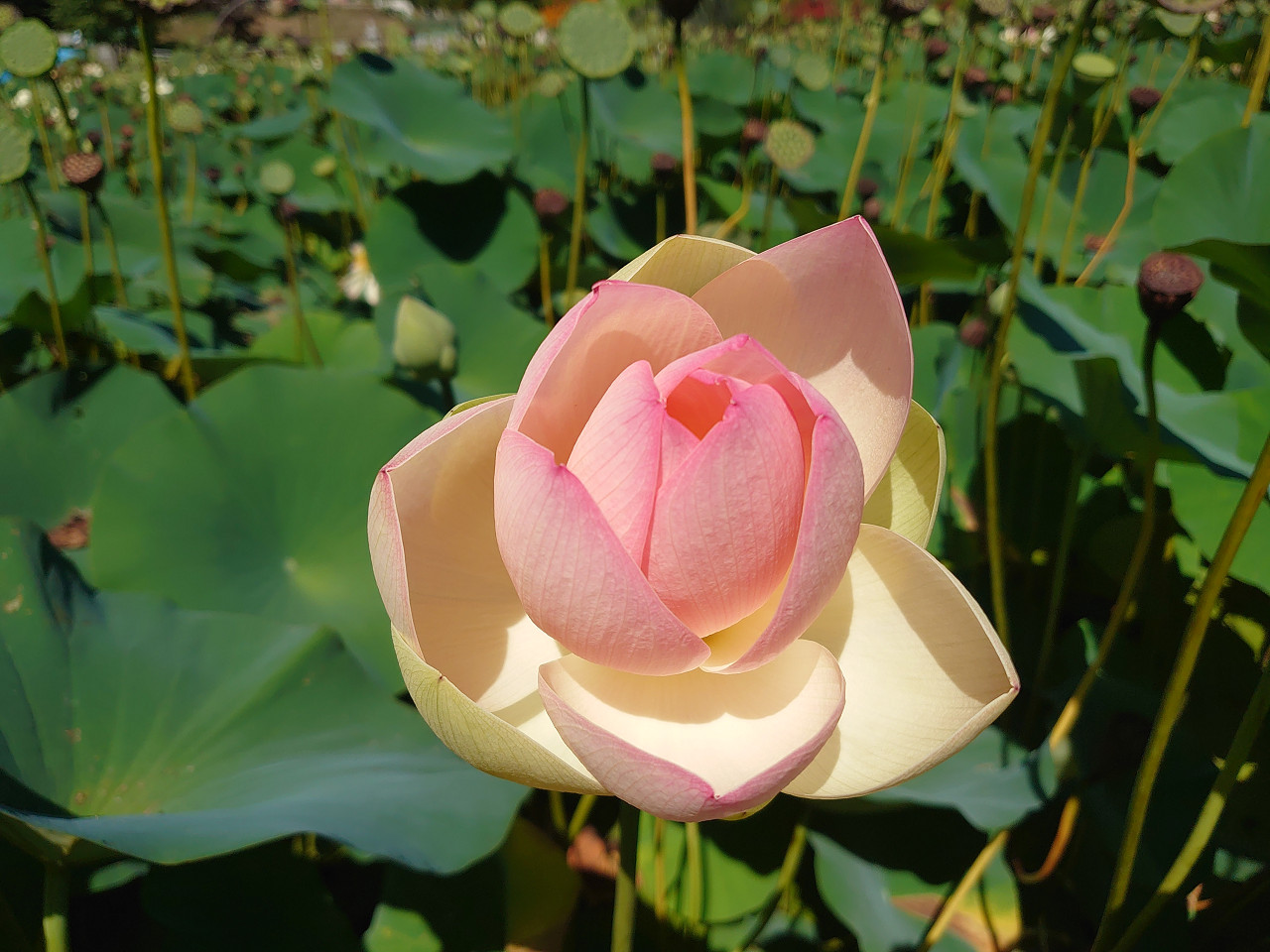 私が行ったときは少し時期が遅かったためか、咲いている花は少なかったのですが、やはり大輪の蓮の花は綺麗でした。
