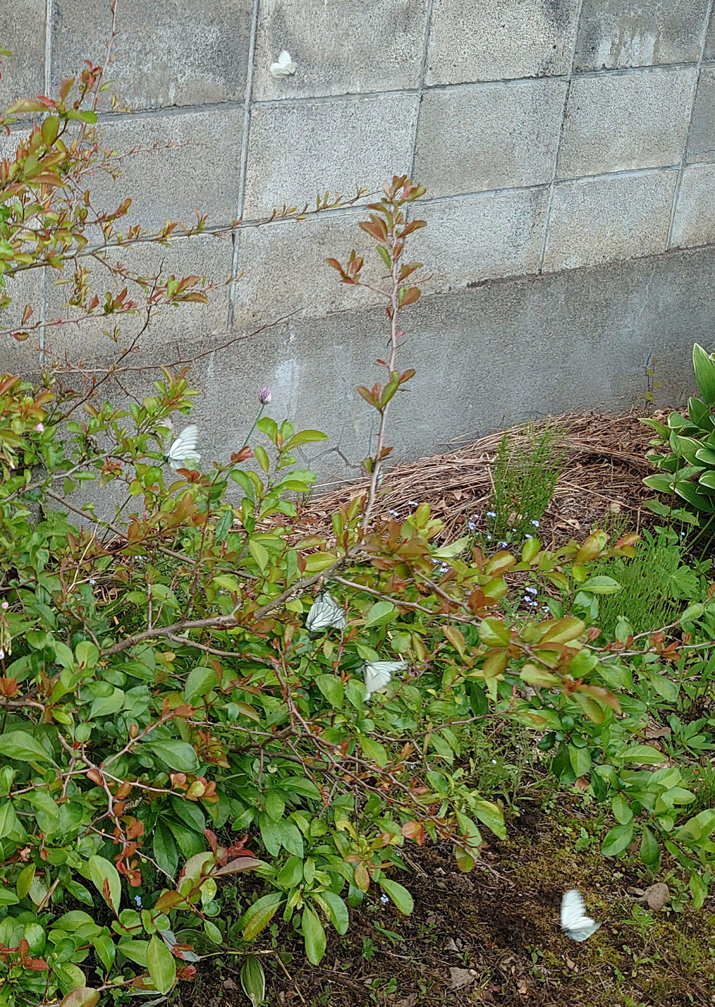先日から裏庭に白いチョウがたくさん飛んでるなと思ってチョウがとんているあたりを見たら、グミの木(たぶん)に幼虫とさなぎがたくさん付いてました。