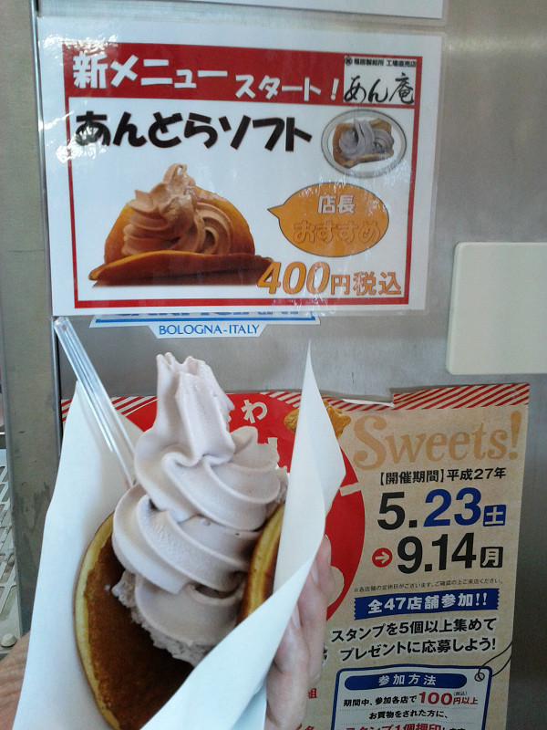 あんどらソフトとは、どら焼きの皮にあんソフトを乗せたもので、ちょっと食べにくいですが一度は経験してみたいソフトです。
