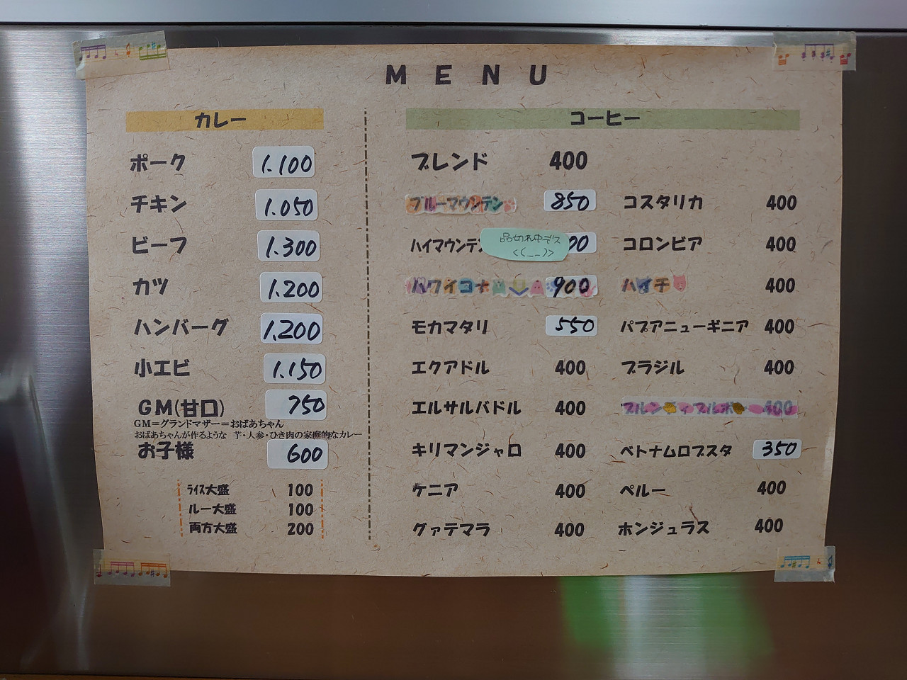 以前の米米亭と同様、カレーの他にコーヒーにも力を入れていて、たくさんの種類のストレートコーヒーがありました。