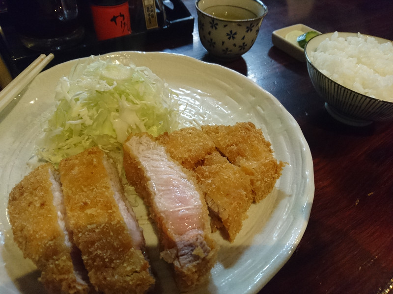 きつね色になった頃、油から上げ、しばらく休ませてからザクザクと切り、あまり多くないキャベツの盛られた皿の上に乗せて、どうぞと配膳されました。
