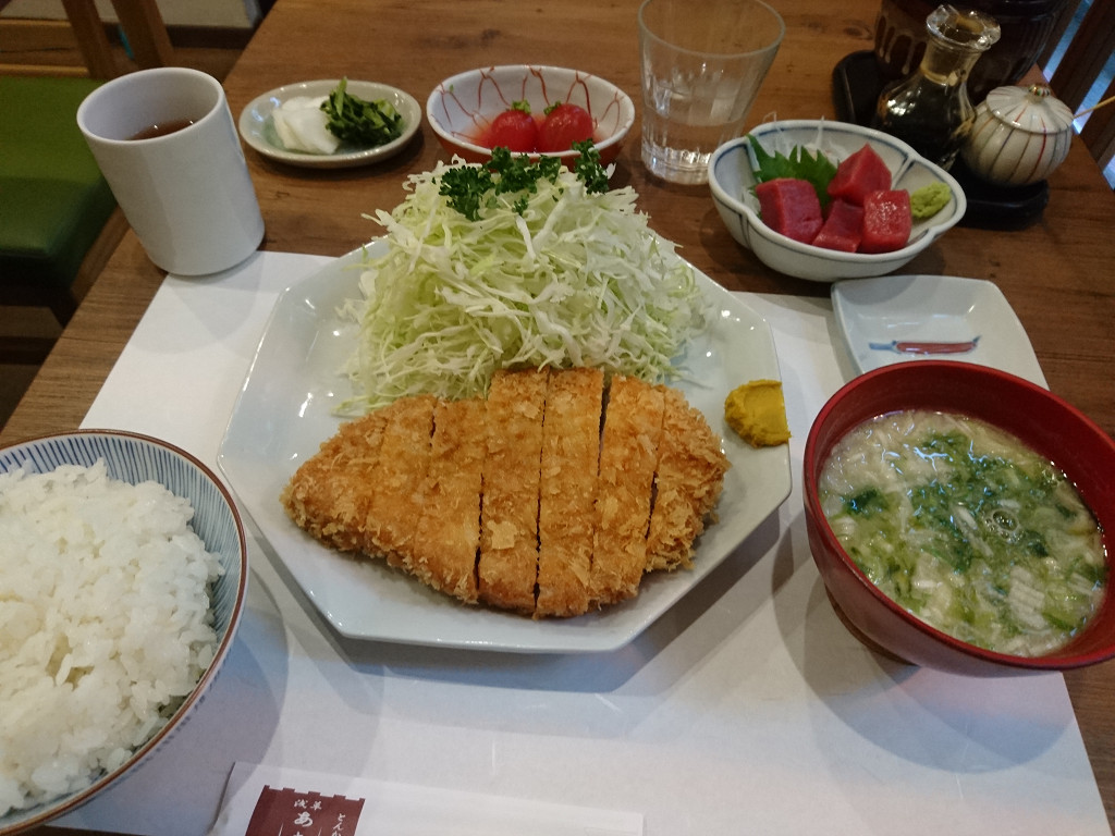 とんかつ以外にマグロのぶつ切り、湯むきした味付けミニトマト、漬け物、そしてご飯とお味噌汁。