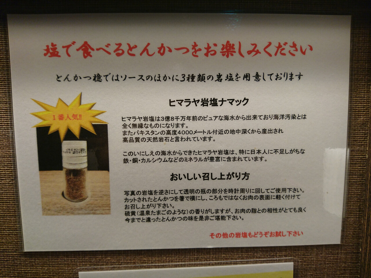 それぞれ美味しいですが、ミルに入っていた茶色い岩塩(ヒマラヤ岩塩ナマック)は、癖はありましたがとんかつと相性が良いのかとても美味しかったです。