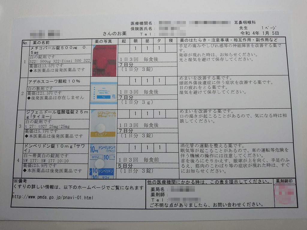 治療は、炭酸水素ナトリウムというめまい止めの血管注射をし、薬を4種類処方された。