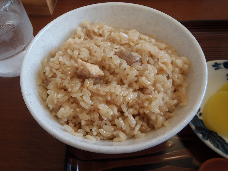 鶏ガラの出汁で炊かれたご飯はつやつやしていて、具のとり肉は小さく刻まれています。味付けは、薄めで少し甘みがあります。