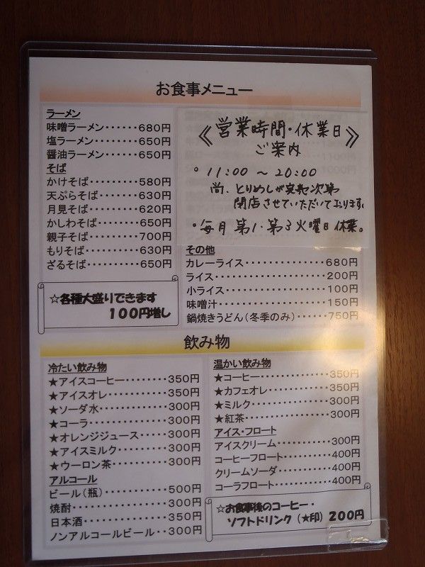 お値段も、ラーメンが味噌が600円、塩と醤油が550円と今となっては安い値段で、その他中華メニューのお値段もほとんどが1,000円以下で、手頃なお値段設定になっています。