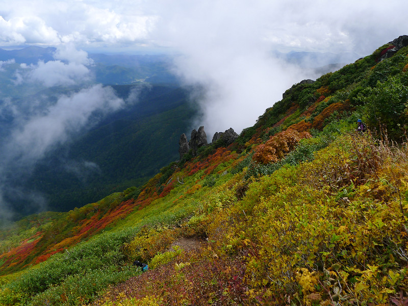 今年は雨こそ無かったものの、登りは雲の中でなにも見えず、下山時に少し雲がはれて紅葉が綺麗に見えました。