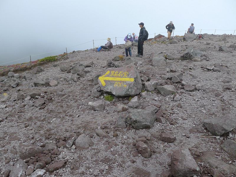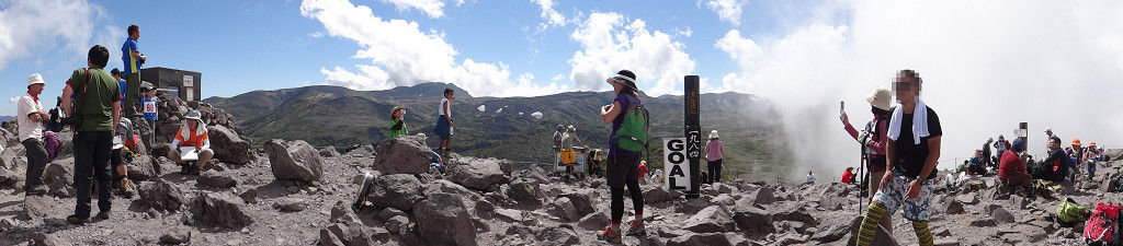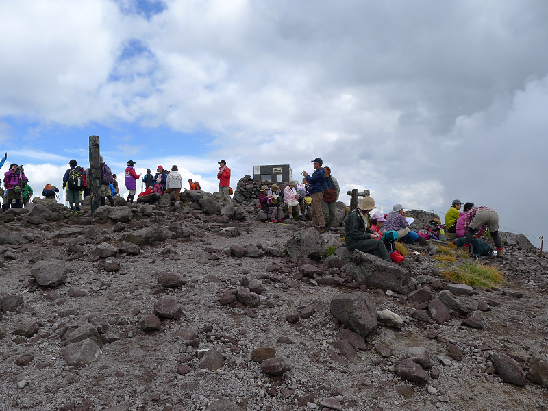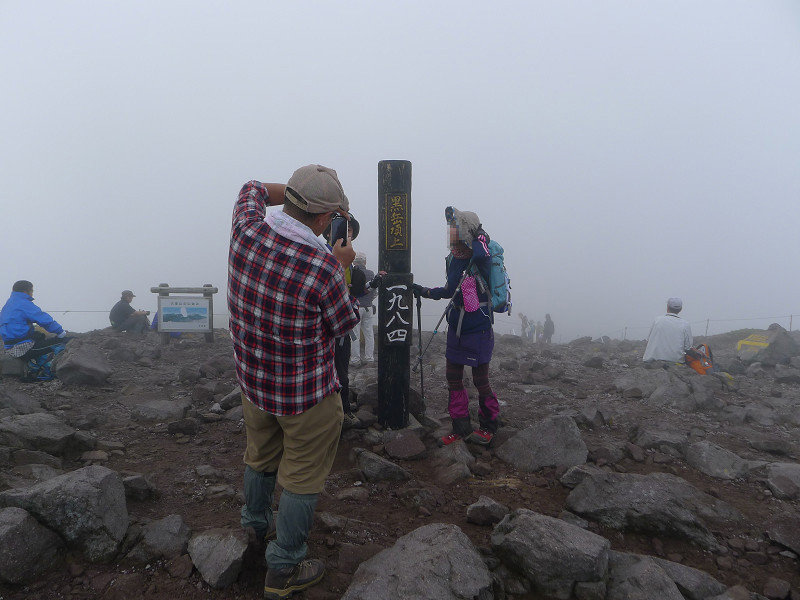 山頂では時たま雲が切れてお鉢方向が見えたので写真を撮影したり、おやつを食べながら友人たちとおしゃべりをして2時間弱ほど滞在しました。