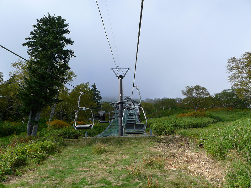 リフトに乗っている間は生憎黒岳山頂はほとんど見えず、途中の景色も雲の中で山頂直下の招き岩もほとんど見えませんでした。