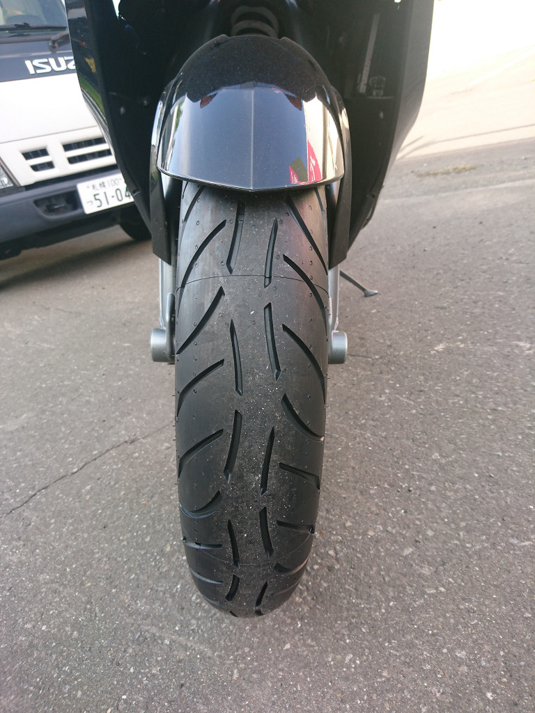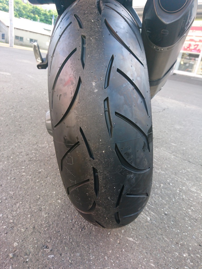 グリップ感やコーナーリング、乗った感じは、高速道路と街中しか走っていないのでまだよくわかりませんが、倒し込みのクセもなく、直進性も悪くないようです。また、ウエット性能もなかなか良いとの事でした。